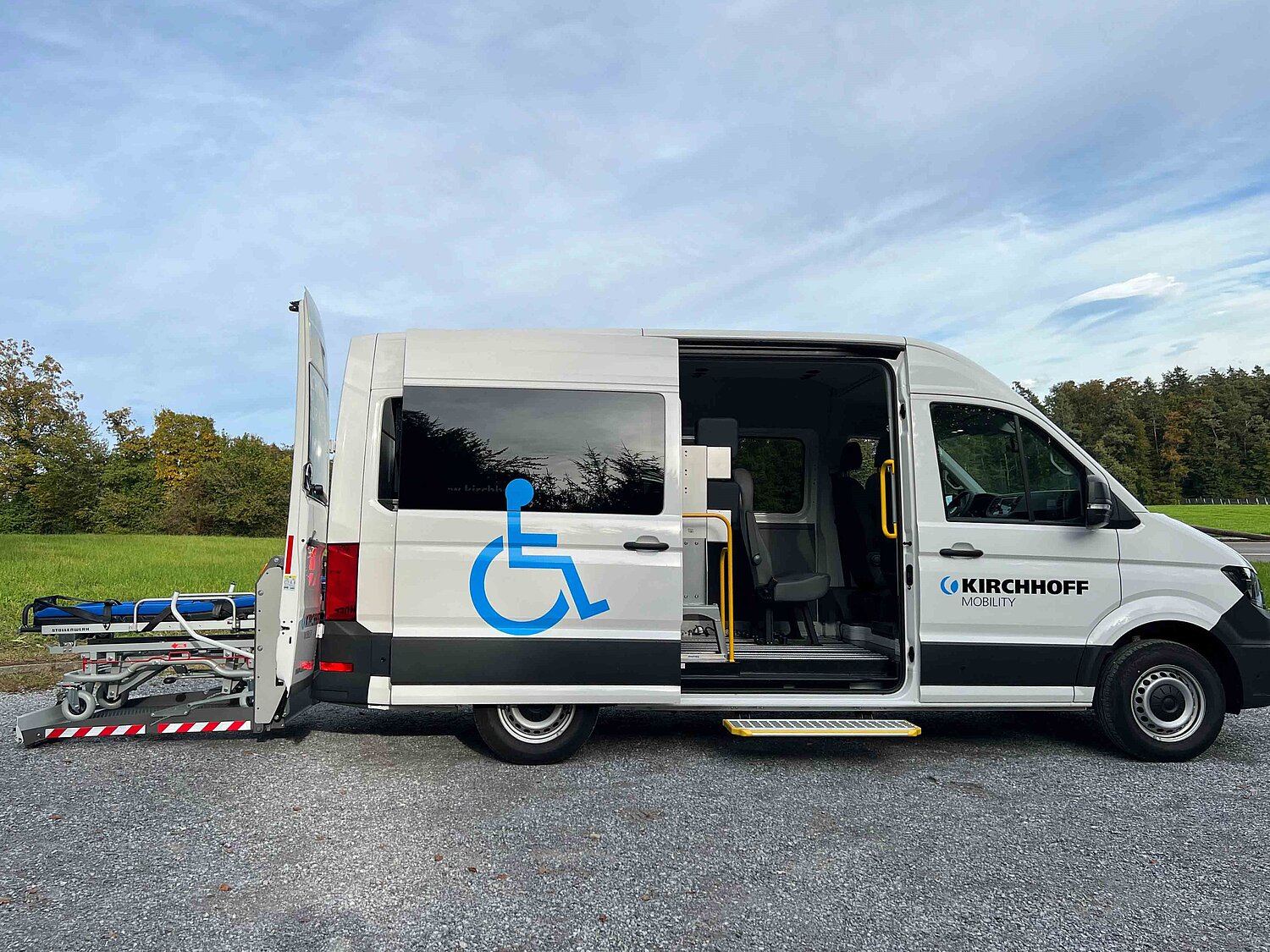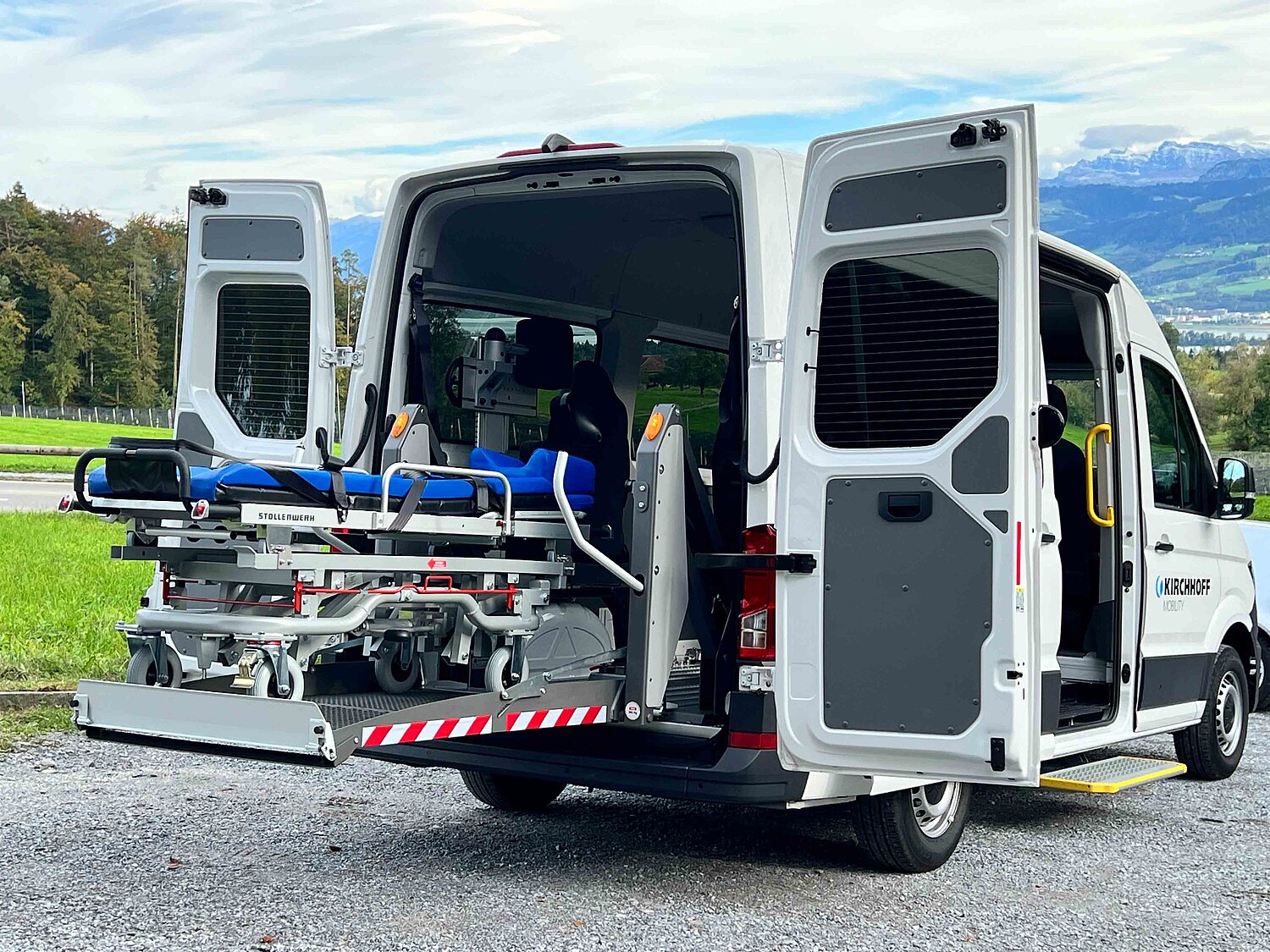 È possibile scegliere tra una rampa o un sollevatore lineare per caricare e scaricare in sicurezza la barella dal veicolo. Ideale per il trasporto in posizione distesa è il pavimento flessibile in alluminio con guide a griglia, che consente di adattare l'interno in modo rapido e semplice alle proprie esigenze.
