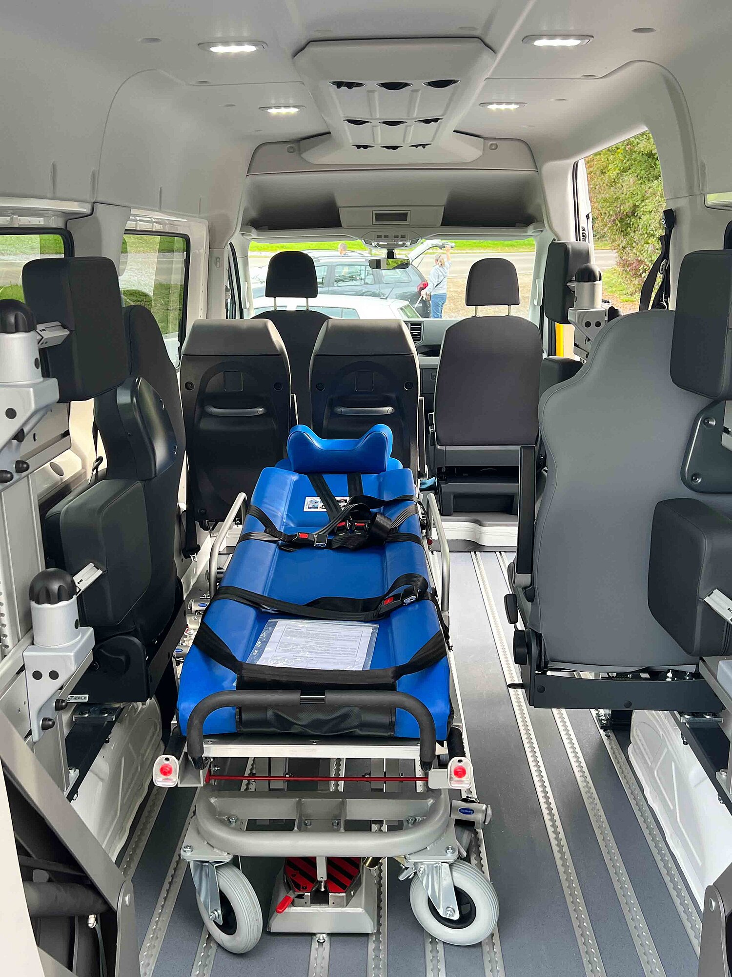 Il trasporto in posizione distesa è possibile anche in veicoli più piccoli, ad esempio nella Volkswagen Caddy 5 Maxi o nella Ford Grand Tourneo Connect in combinazione con la nostra conversione posteriore 86.