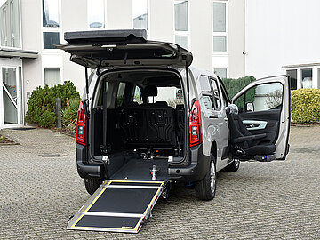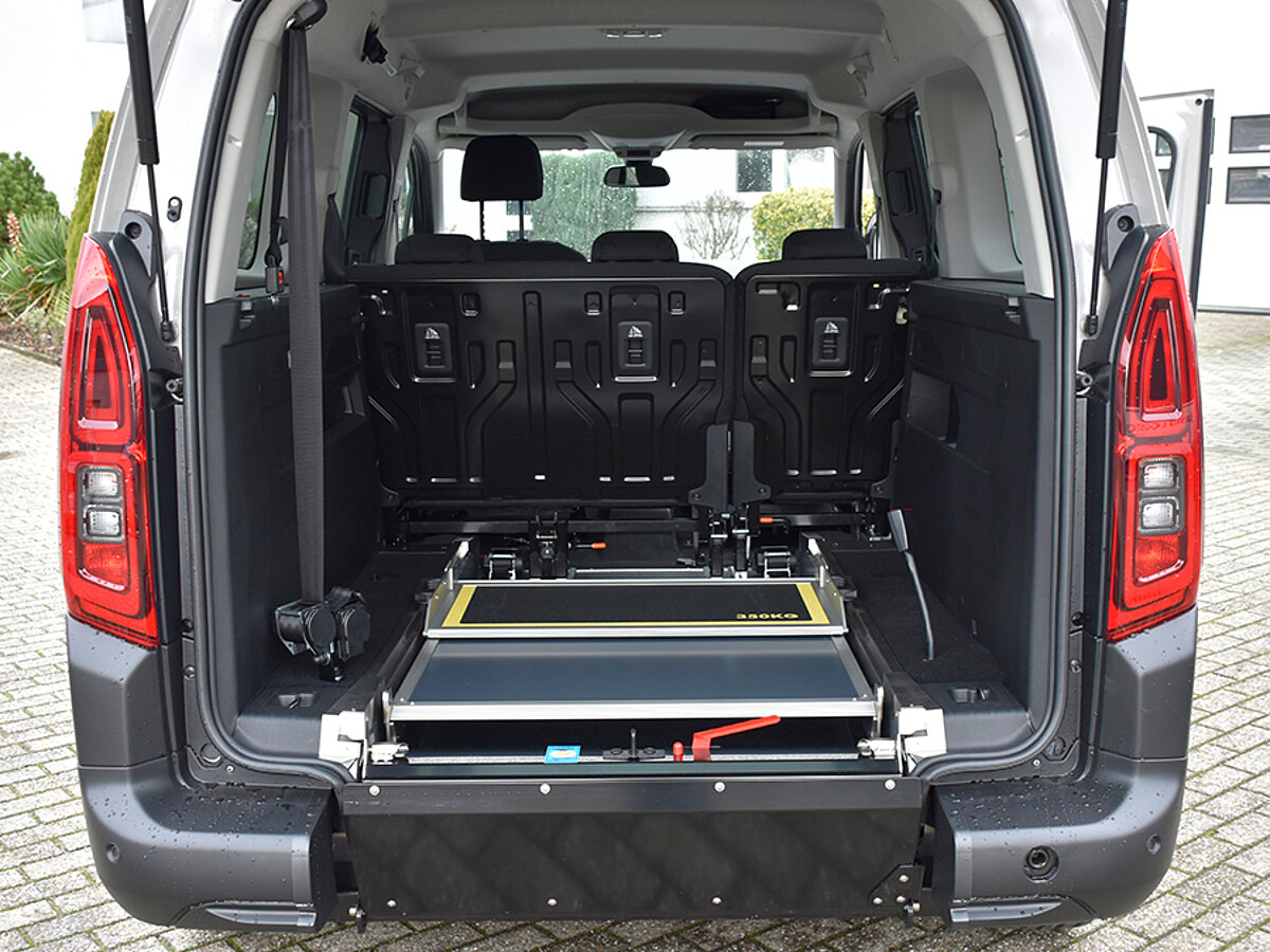 Der Citroën Berlingo (hier abgebildet mit dem Hub-Schwenksitz <link 473 - internal-link "Opens internal link in current window">Turny Evo</link>) bietet serienmäßig zwei Personen und einem Rollstuhlfahrer Platz. Optional können Sie, je nach Ihren individuellen Nutzungswünschen, weitere Sitze im Heck montieren.
