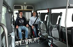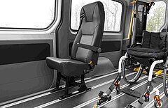 Rollstuhlgäste gelangen mit Hilfe einer Alu-Faltrampe oder Linearlift im Heckbereich in das Fahrzeug. Der Fahrgastraum lässt sich durch verschiedene Umbaumöglichkeiten individuell und schnell an die Anforderungen des Alltages anpassen, beispielsweise mit einem Alu-Systemboden und herausnehmbaren Sitzen. Bis zu 8 Sitze und bis zu 4 Rollstühle sind möglich.