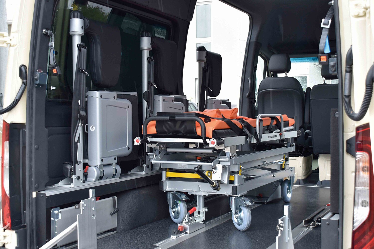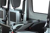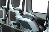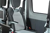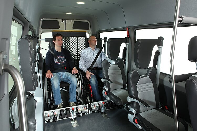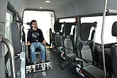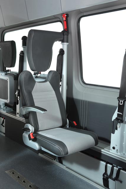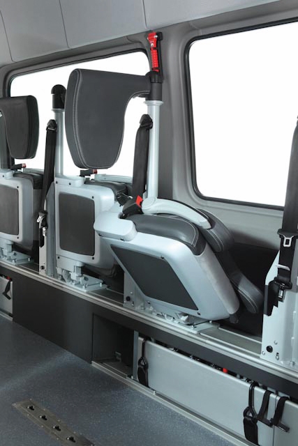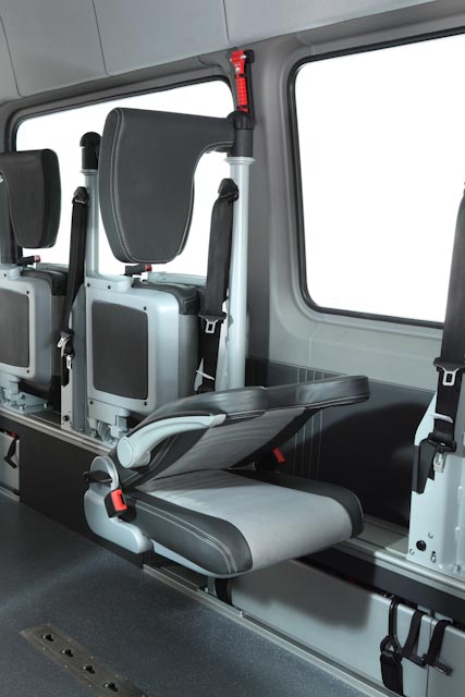 Für Rollstuhlfahrer lassen sich aus der Box Tragarme mit Rückhaltgurten ausklappen, Kopfstütze und Sicherheitsgurt individuell einstellen. Bei normalen Passagieren verwandeln ergonomische Klappsitze auf verschiebbaren Rasterschienen die Box in flexible Sitzplätze. So ist immer maximale Sicherheit, Komfort und Platznutzung gewährleistet.