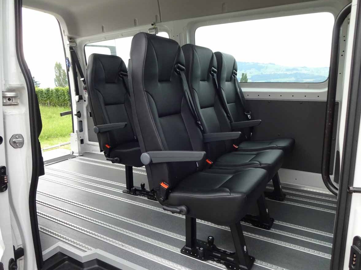 Herausnehmbare Sitze lassen sich dank Einhand-Schnellverschluss schnell verschieben oder komplett entnehmen. In Kombination mit dem Alu-Systemboden ist die Sitzanordnung nahezu frei wählbar – auch entgegen der Fahrtrichtung.