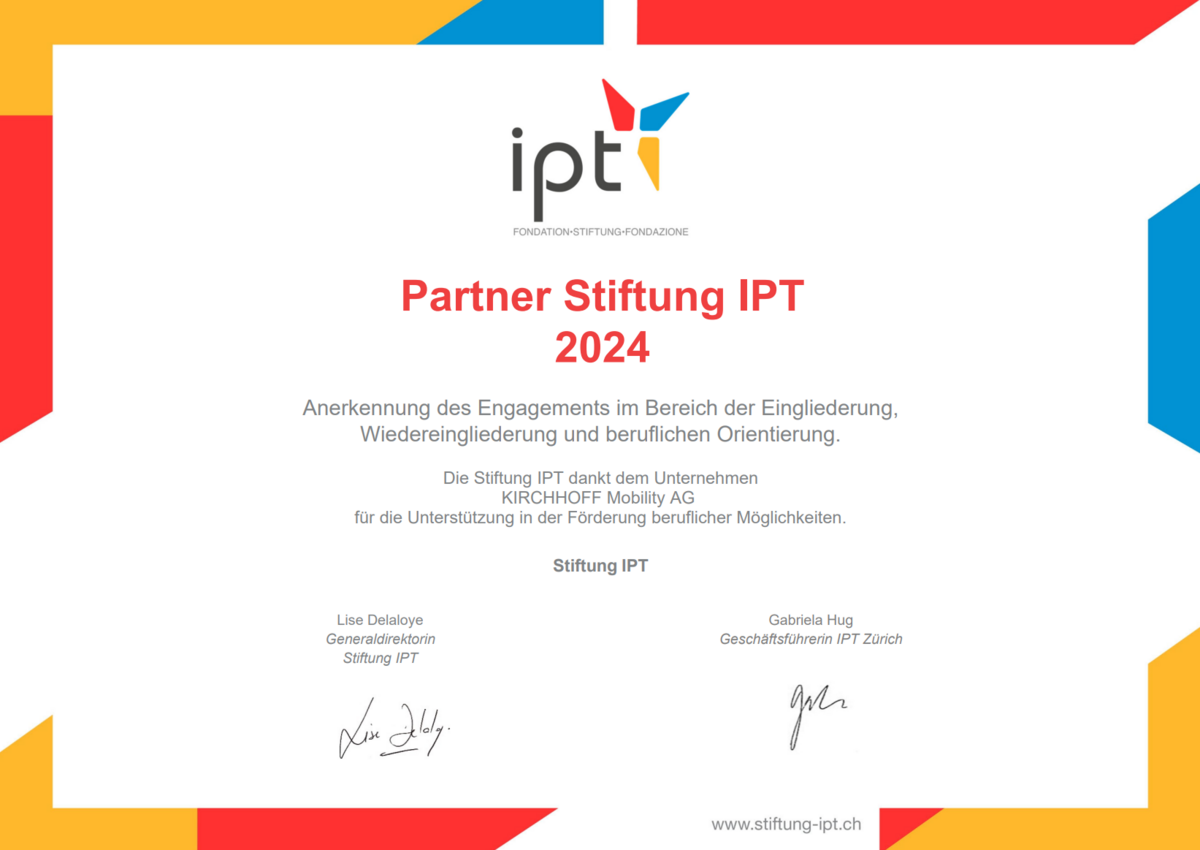 KIRCHHOFF Mobility AG ist stolzer Partner der Stiftung IPT, die über ein Netzwerk von mehr als 15.000 Unternehmen in der ganzen Schweiz verfügt. Gemeinsam setzen wir uns für die berufliche (Wieder-)Eingliederung und Orientierung von über 5'500 Personen pro Jahr ein.